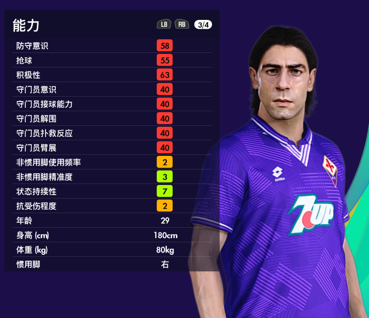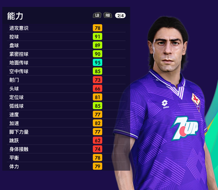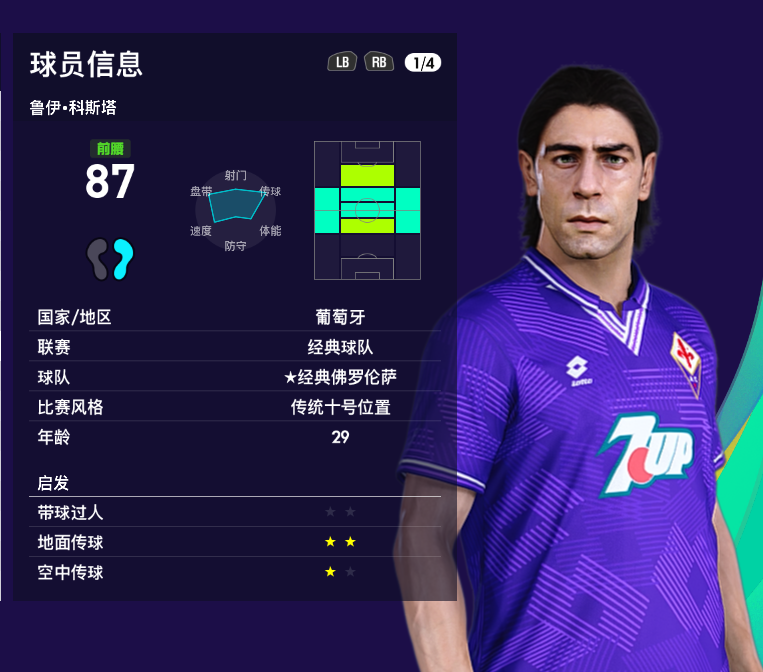 游戏里的鲁伊科斯塔隶属【经典佛罗伦萨】,地面传球95,控球91,进攻意识只有78,射门只有73,对于打入42粒意甲进球,20粒国家队进球的鲁伊来说,确实低了一点。