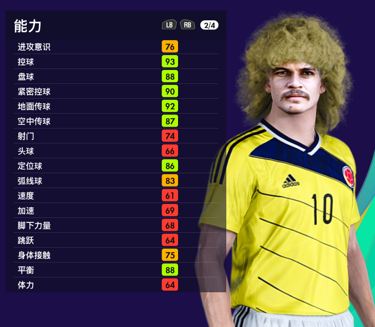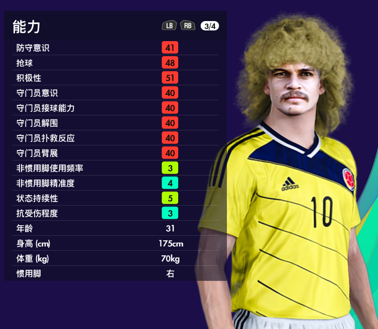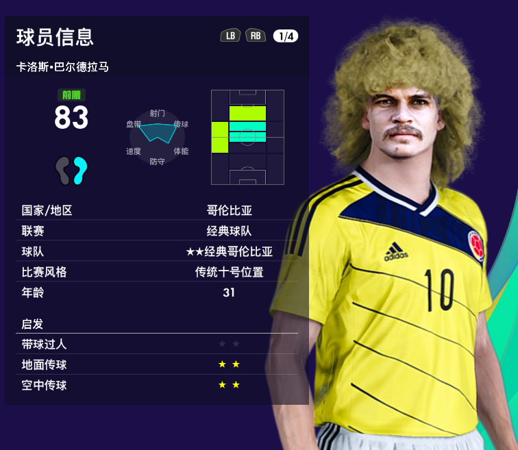 首先形象做得非常的好,数据上反差很大,头球、体能、速度很差,但是现实里他也进过难度很大的头球,所以也是仁者见仁智者见智吧,游戏里狮王隶属【经典哥伦比亚】。