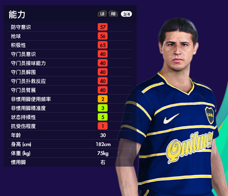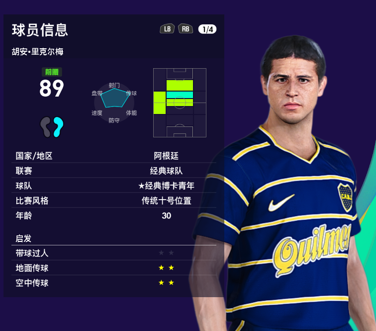 游戏里里克尔梅隶属【经典博卡青年队】,地面传球达到了高亮的96,其他数据感觉也比较接近,不过这个发型稍显油腻。