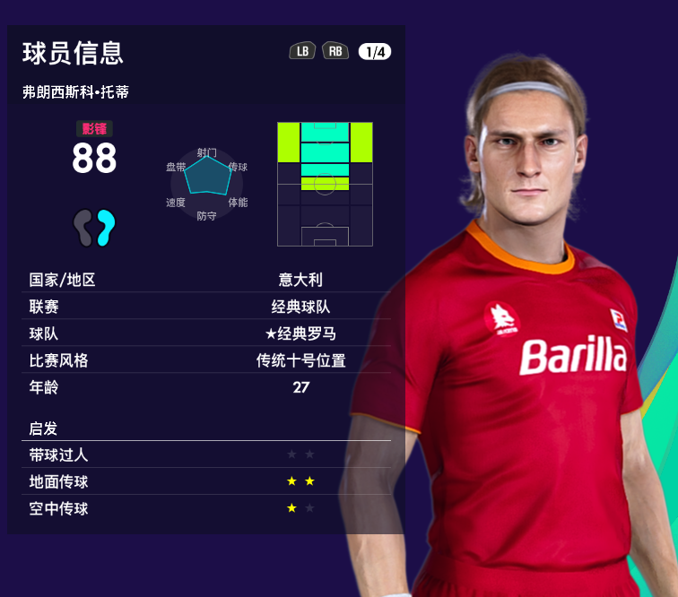 实况足球2021里托蒂在【经典罗马队】里面,游戏里的数值个人觉得稍低,尤其是速度,只有72。小伙伴们可以留言讨论一下。