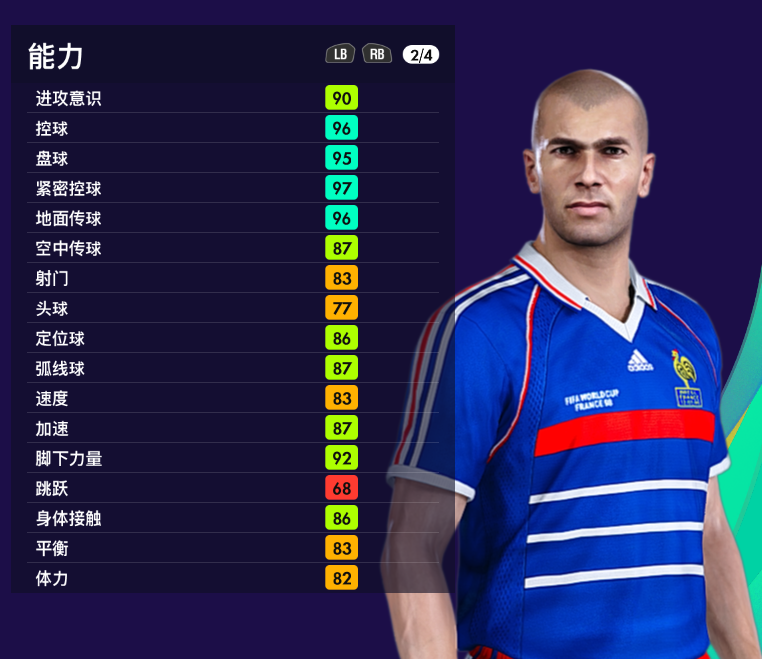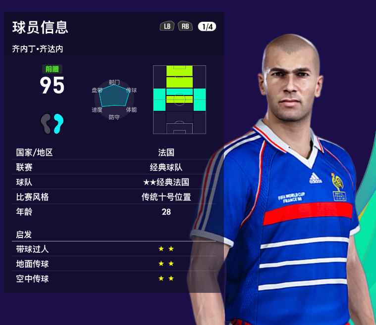游戏里齐达内属于【经典法国队】,里面的数据也体现出齐达内的超强控球能力和传球能力,弹跳稍弱,其他数据还是比较平均,相对于其他古典前腰来说,数据还是相当不错了。
