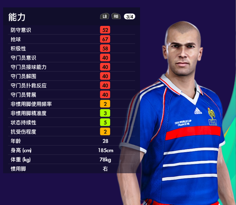 实况端游传奇明星队中也有齐达内,但因为没有授权使用的是假名,并且无法上架。不过从他的属性来看,模型和对抗都很强,速度也不存在短板,放在现有前腰中恐怕就是独一档的存在。