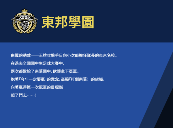 副主角日向小次郎本在琦玉县的明和小学,初中后作为特招生被东邦学园相中。