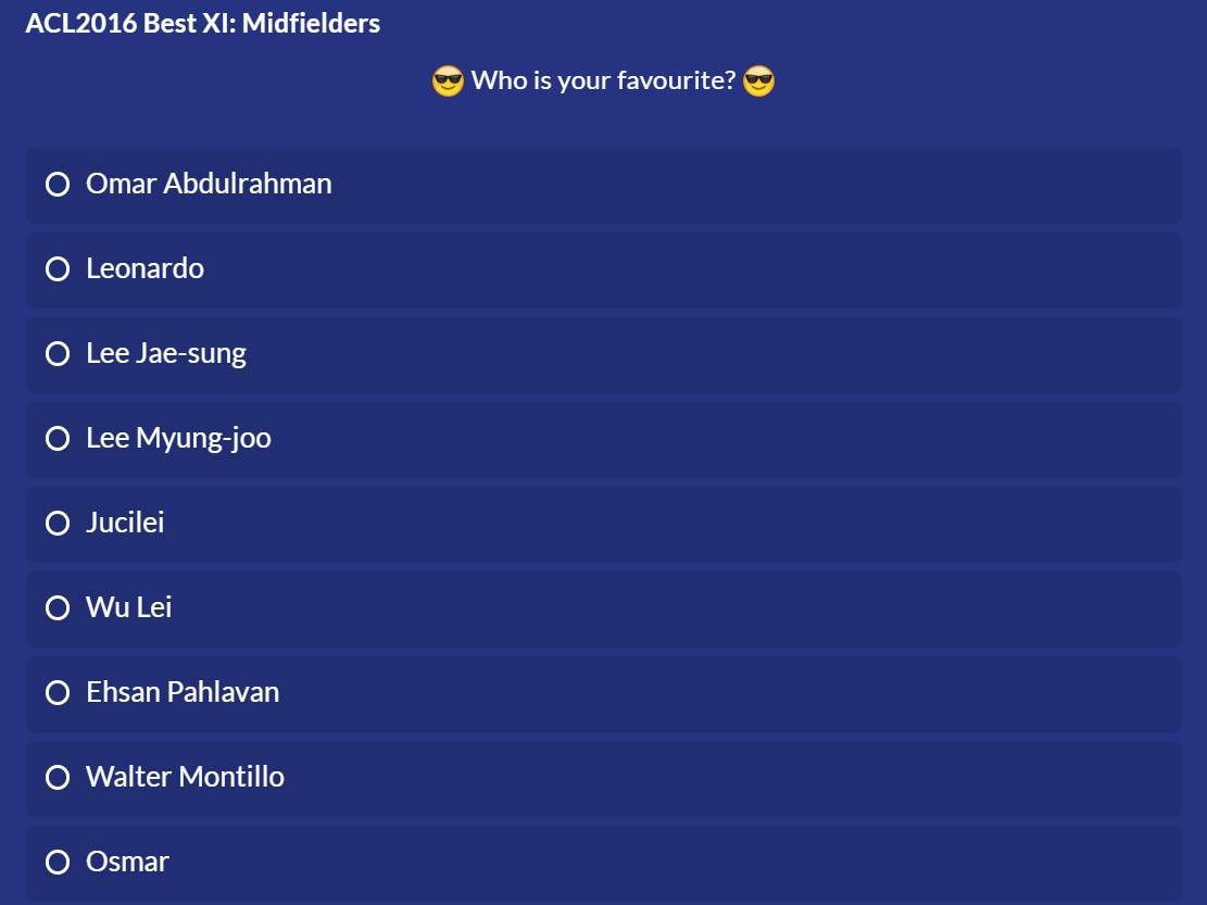 此外,亚足联还介绍了2016赛季效力于艾因的奥马尔-阿卜杜勒拉赫曼、李明周,全北现代的莱昂纳多、李在城,佐布阿汉的伊赫桑-帕赫莱万,首尔的奥斯马尔。投票链接(如果无法跳转,请点击以下链接:https://www.the-afc.com/competitions/afc-champions-league/latest/news/vote-for-your-best-acl2016-team-midfielders)
