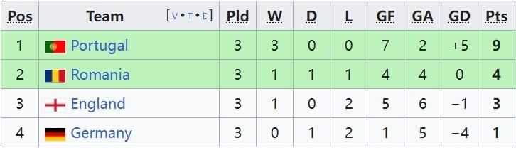【末轮】英格兰2-3罗马尼亚,葡萄牙3-0德国