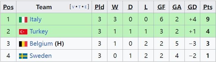 【末轮】土耳其2-0比利时,意大利2-1瑞典
