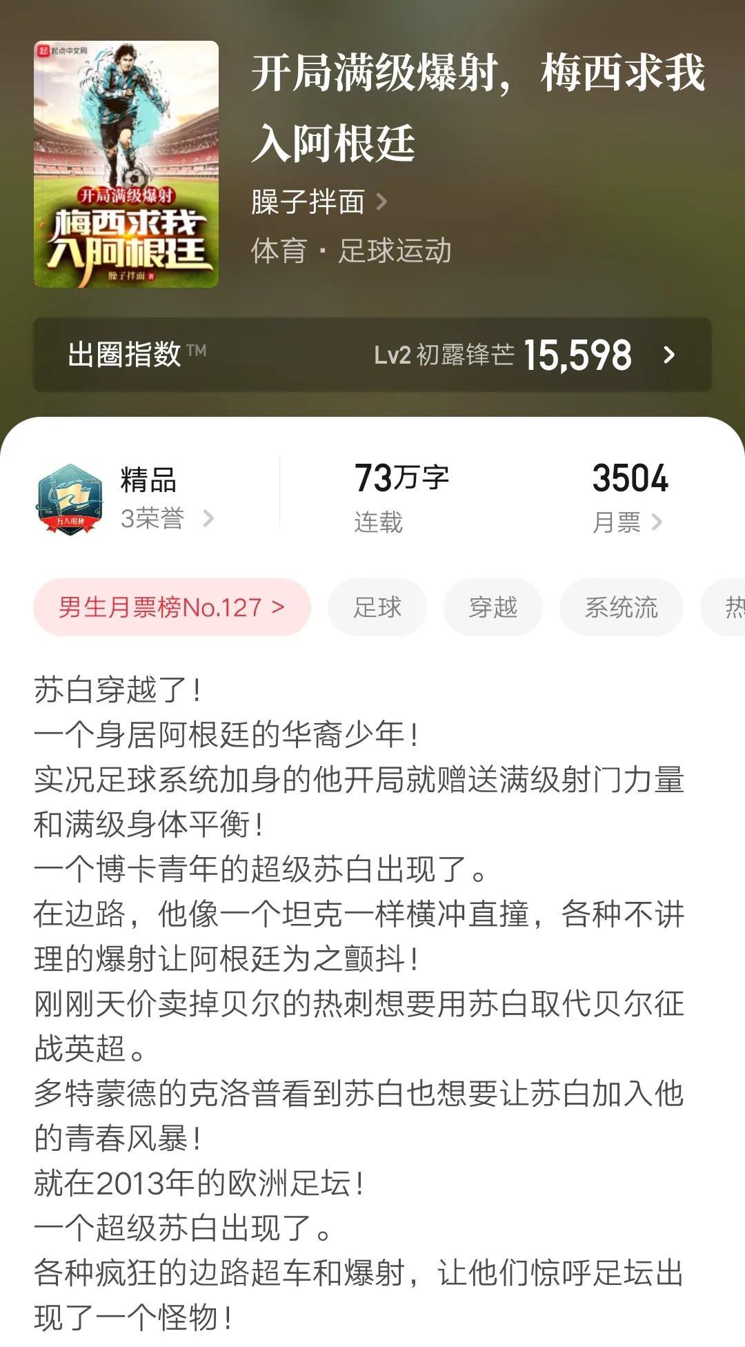 上篇说过了烟火成城新书《武德充沛》达成万订的事情,这篇我们来说说《开局满级爆射,梅西求我入阿根廷》这本新增的万订作品。