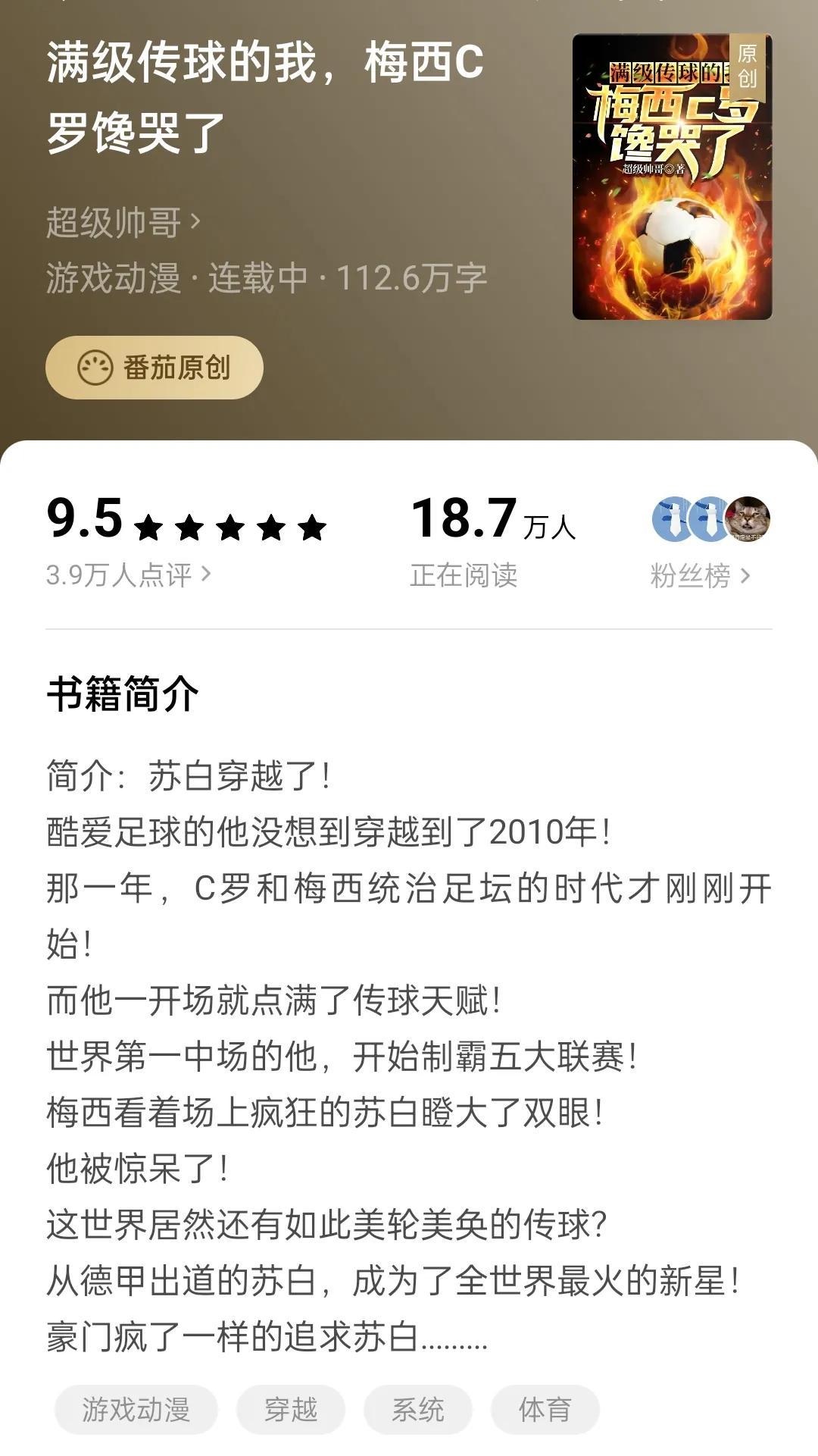 另外作者看情况还是双开,另有一本百万字的老书《满级传球的我,梅西C罗馋哭了》在番茄连载。看一些读者的反馈,这本小说就是后面写了国足的剧情,导致口碑和成绩严重下滑了,才让作者跑起点来双开的。