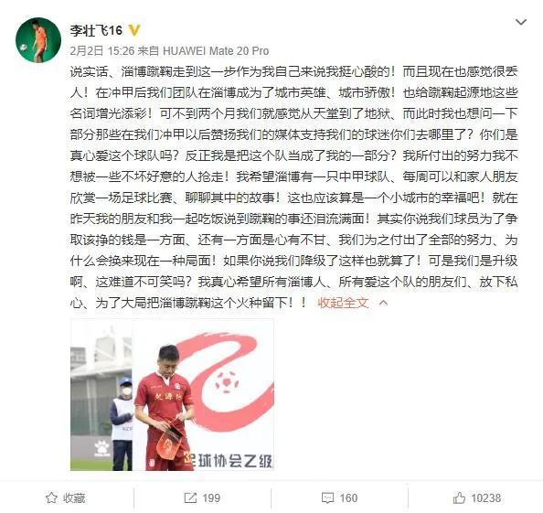 李壮飞还在微博上留下了这样一段话:“我希望淄博有一支中甲球队,每周可以和家人、朋友欣赏一场比赛,聊聊其中的故事,这也应该是一个小城市的幸福吧。真心希望所有淄博人、所有爱这个队的朋友们,放下私心,为了大局把淄博蹴鞠这个火种留下。”