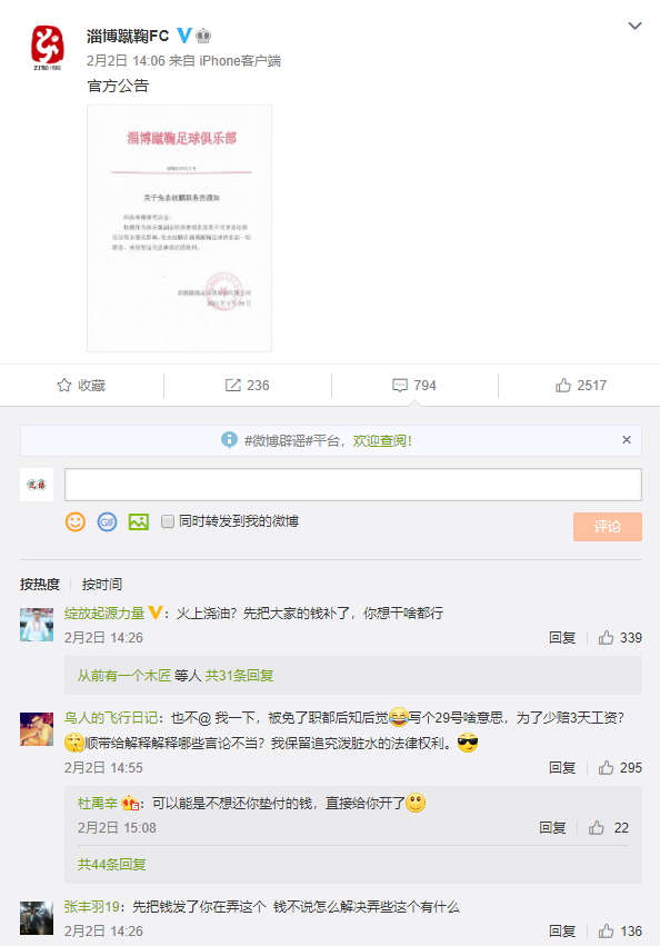 2月2日,淄博蹴鞠俱乐部发布声明,免去俱乐部副总经理兼领队赵鹏的一切职务,并保留追究法律责任的权利,原因是赵鹏“发表不当言论”。结果公告发出后,评论区成为大型翻车现场,仅仅6个小时时间评论近700条,转发超过200条,俱乐部球员、工作人员,包括赵鹏都予以反击,无数国内足球媒体和媒体人表达了不理解,更多的淄博蹴鞠球迷表达了愤怒。