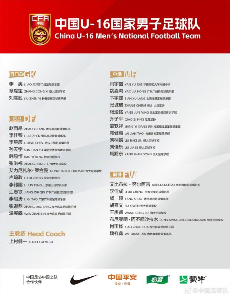 直播吧5月17日讯 中国足协公布U16国家男子足球队第四期集训名单,日本籍教头上村健一挂帅,恒大足校共有11人入选。
