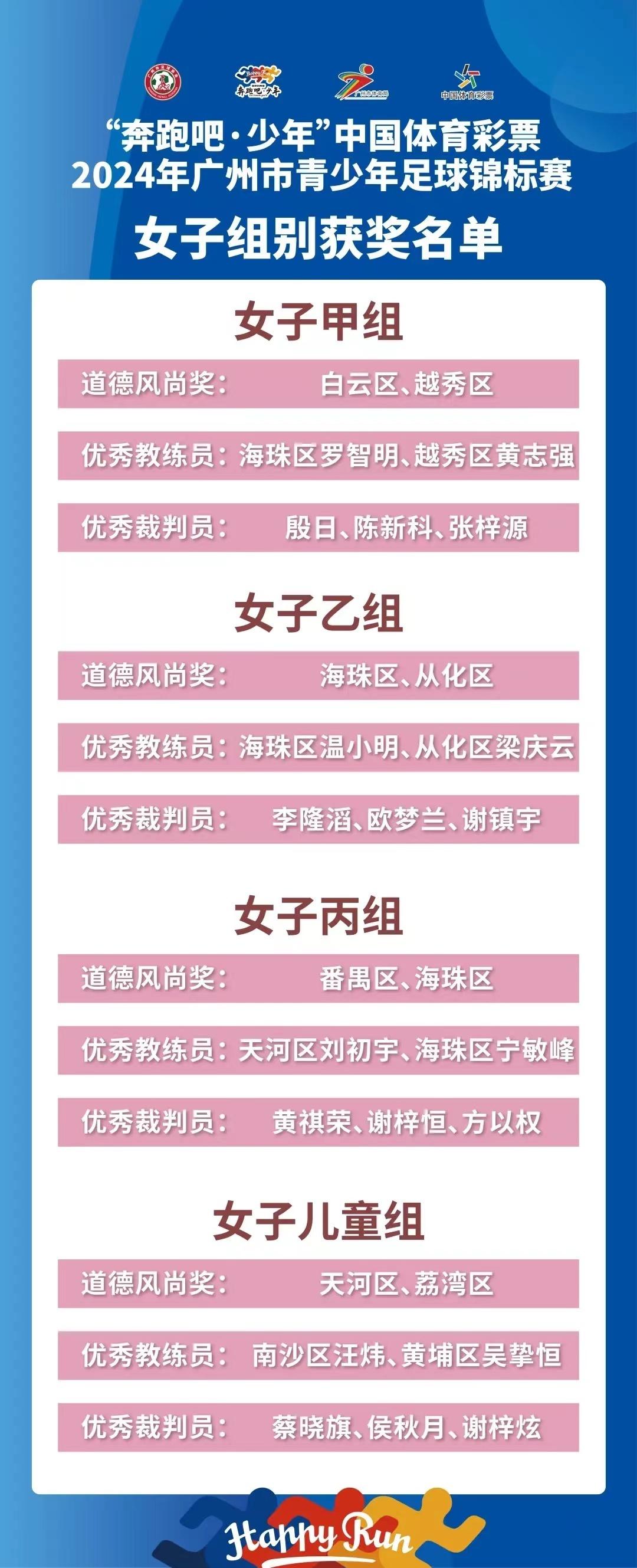 女子儿童组:1,南沙区、2,海珠区、3,从化区、4,黄埔区、5,荔湾区、6,越秀区、7,天河区、8,番禺区、9,花都区、10,增城区
