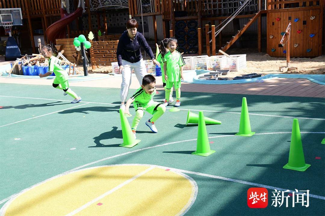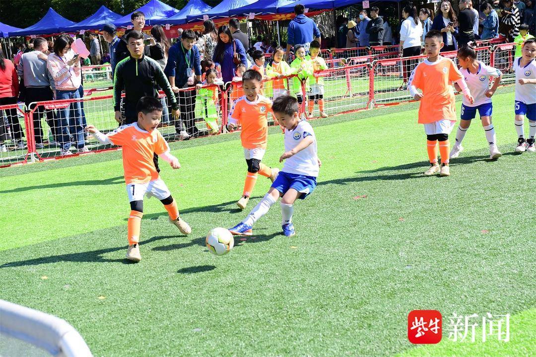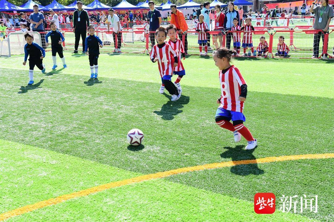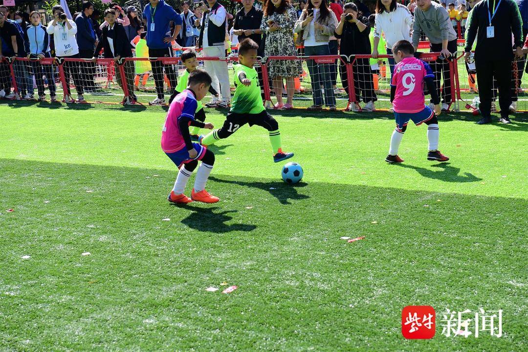 南京市第八届幼儿足球嘉年华活动由幼儿足球基本动作展示、“三人四节”制足球活动、趣味团队活动、幼儿足球吉尼斯和科体艺课程体验等环节组成。在“迷你版”的球场、球门间,萌娃们仿佛一个个缩小版的足球健将,抿着嘴、拧起眉,穿梭在赛场,认真对待每一球的严肃模样,将现场观众的情绪也带动起来,陪着萌娃们上了一堂形式丰富的“沉浸式趣味足球体验课”。