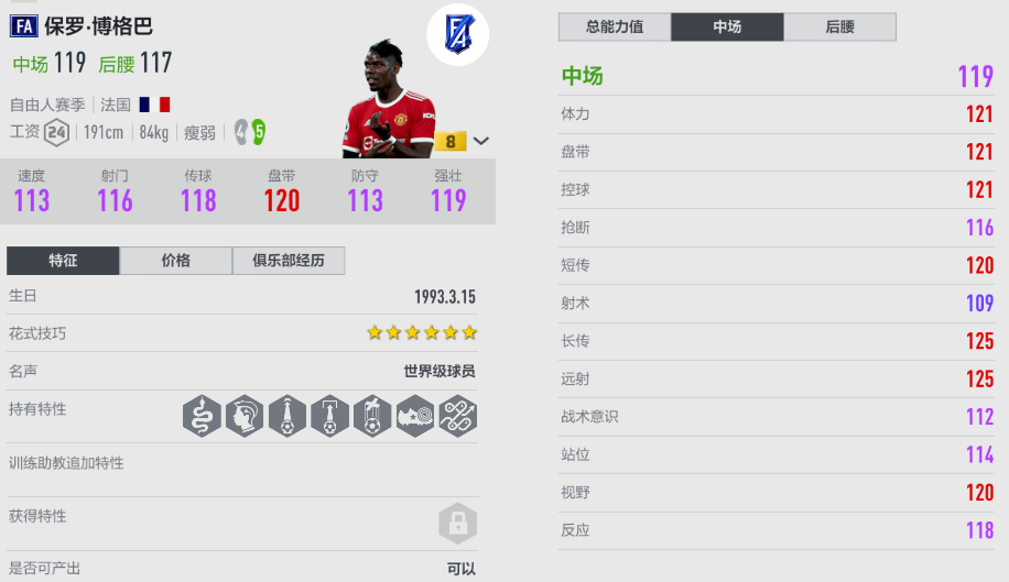 游戏中的博格巴,是毫无争议的顶级中场,从BTB到此前的LH,都是优先级很高的全能中场选择。FA赛季具备了很好的攻防均衡性,同时和E21等赛季相比,他回防参与防守的倾向较高,出任双后腰的作用更明显。FA博格巴的手感很柔和,他具备拿球推进摆脱和发牌的能力 ,不怕对方的高压逼抢,需要的时候能从中路带球推进,给比赛提速。博格巴插上的远射势大力沉,精准度有保证 ;前锋如果在跑位,博格巴可以观察时机送出直塞,让他出任前腰也是个选择。考虑性价比,EBS赛季更有优势,不过如果需要一个攻守更加均衡的后腰,那么FA也可以作为选项之一。