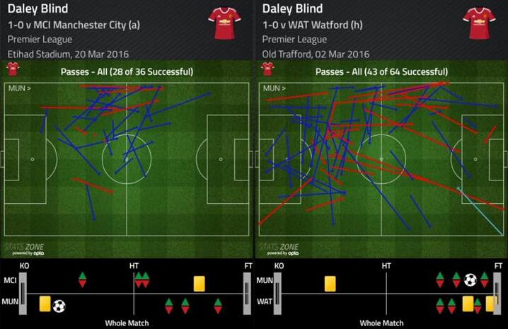 我们可以看到数据图中布林德在1-0战胜曼联和1-0战胜沃特福德比赛中的传球分布图,红色箭头表示传球失误,蓝色是成功传球,而浅蓝色则是助攻。