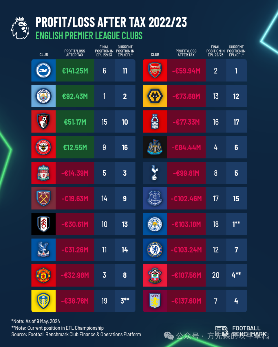 根据数据机构footballbenchmark对世界第一大联赛英格兰超级联赛中20家俱乐部的财务状况的分析报告,22/23赛季整个英超的总赤字为8.16亿欧元。其中只有四家俱乐部能够实现盈利:布莱顿足球俱乐部(1.41亿欧元)、曼城足球俱乐部(9200万欧元)、伯恩茅斯足球俱乐部(5100万欧元)和布伦特福德足球俱乐部(1300万欧元)。