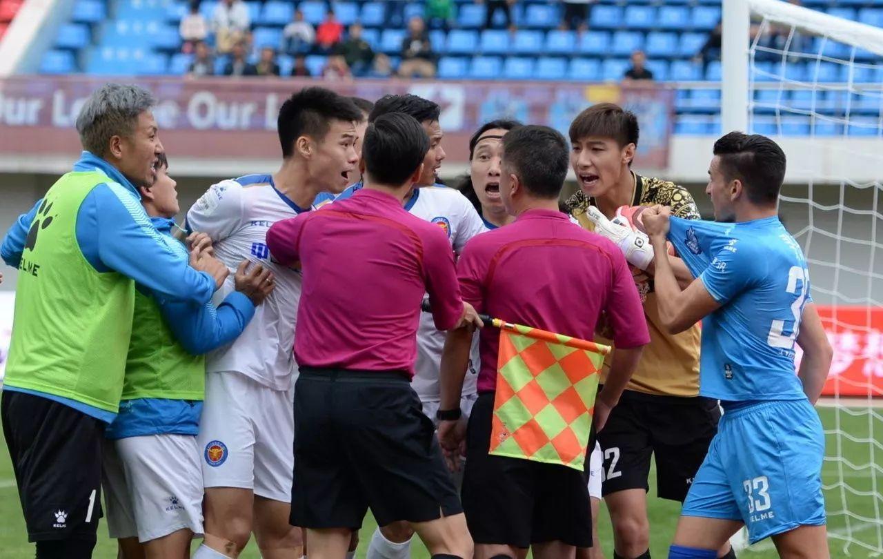 上半场第36分钟,丽江队外援纳塔里奥在对方禁区与毅腾防守球员何杨有身体接触,随后摔倒,陈钢在征求底线裁判周刚的意见之后给了丽江队点球。这时候,毅腾球员情绪非常激动,场边替补席上的球员和官员相继冲进场内,围着周刚理论,比赛一度暂停。