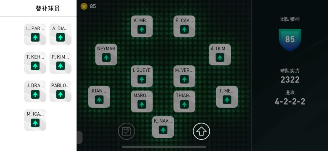 这种队套的所有球员积分乘数全部是480%,并且临场箭头全部为直上,并且都是一级数据,这种情况下还是推荐大家选择一些球员一级强悍的豪门球队来进行match day对抗。