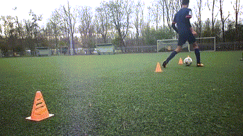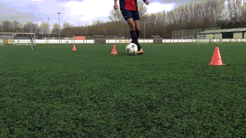 用你的弱势脚跨过皮球,然后再用外脚背向外拨球,这项练习可以让你的弱势脚更好的适应过人动作。