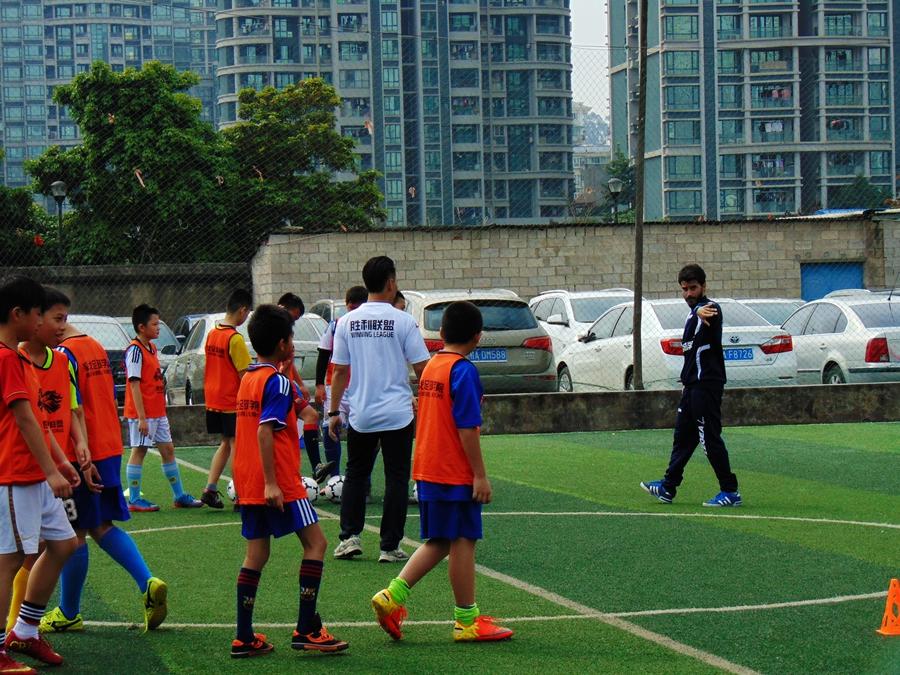 外籍教练米格尔指导小球员,进行双语足球培训
