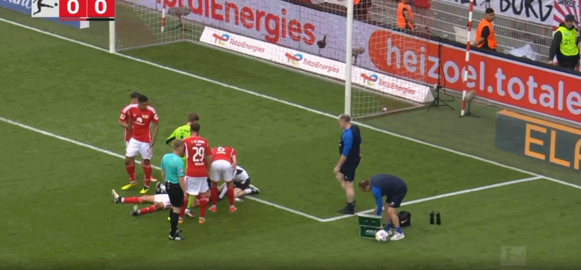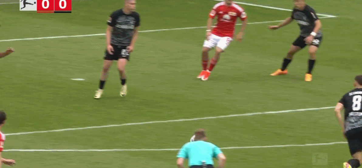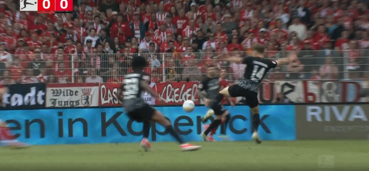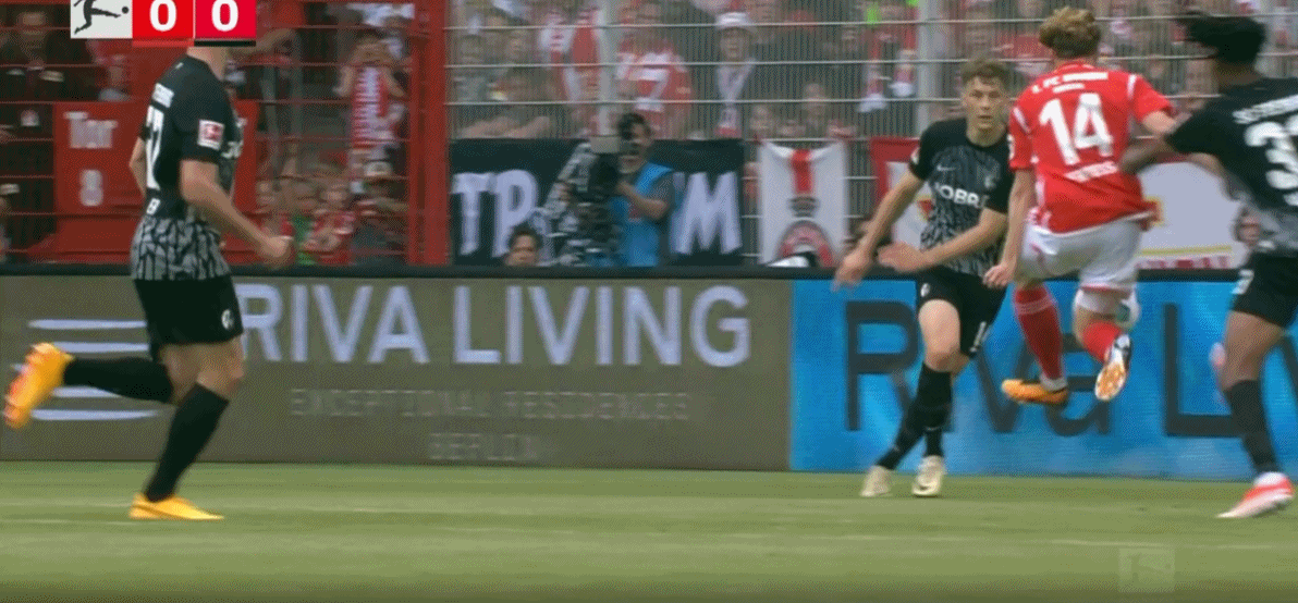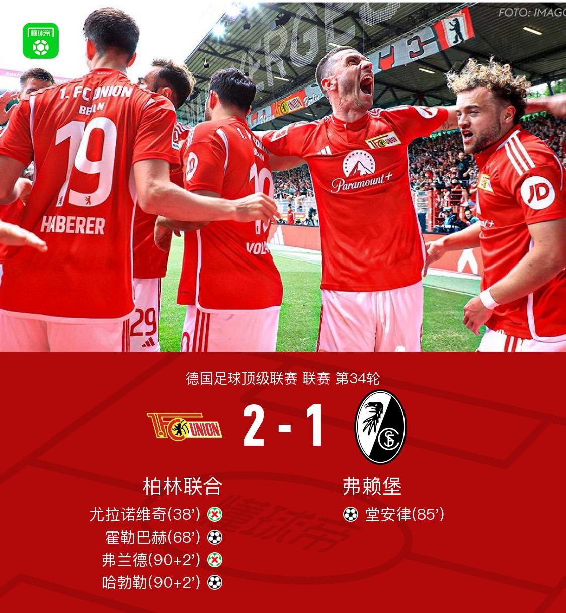 5月18日,德国足球顶级联赛第34轮,柏林联合在主场迎战弗赖堡。上半场,费尔特森抽射被门将没收,尤拉诺维奇点球被门将扑出。下半场,霍勒巴赫抽射破门,堂安律头球扳平,弗兰德点球中柱弹出,哈勃勒跟进补射绝杀,最终,柏林联合2-1补时绝杀弗赖堡,以净胜球优势惊险保级。