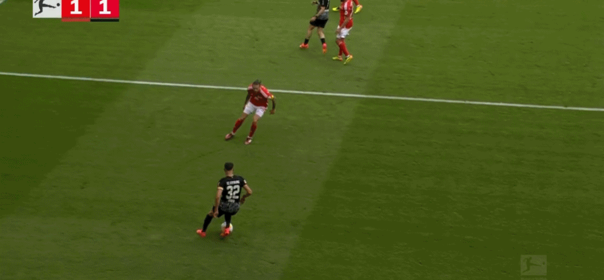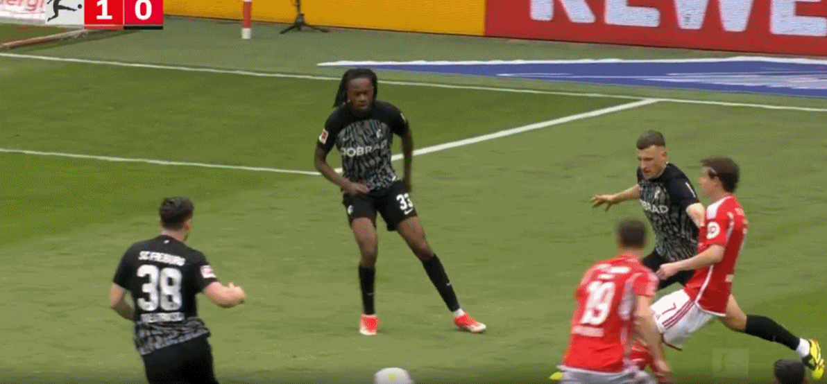 第85分钟,格里福左路传中,堂安律头球破门!弗赖堡1-1