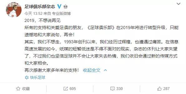 1月7日中午,《足球俱乐部》杂志的官方账号终于发出了一条微博,这距离他们上一条发出原创信息,已经过去了整整4个月。只是,此番久别重逢,却只是江湖再见——