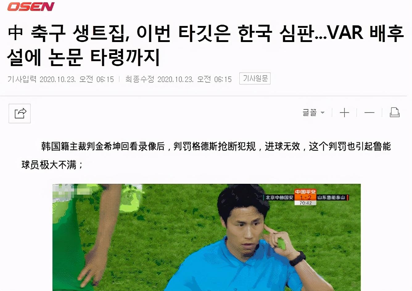 对于金希坤的这次判罚,韩国媒体《OSEN》分析道 ,“VAR助理裁判马宁代表着中方的立场,韩国裁判了解此前发生的裁判争议,只得被迫同意取消进球。”文章的最后,《OSEN》指出“VAR 的目的应是辅助主裁判和助理裁判,而不是成为比赛的决定者。”