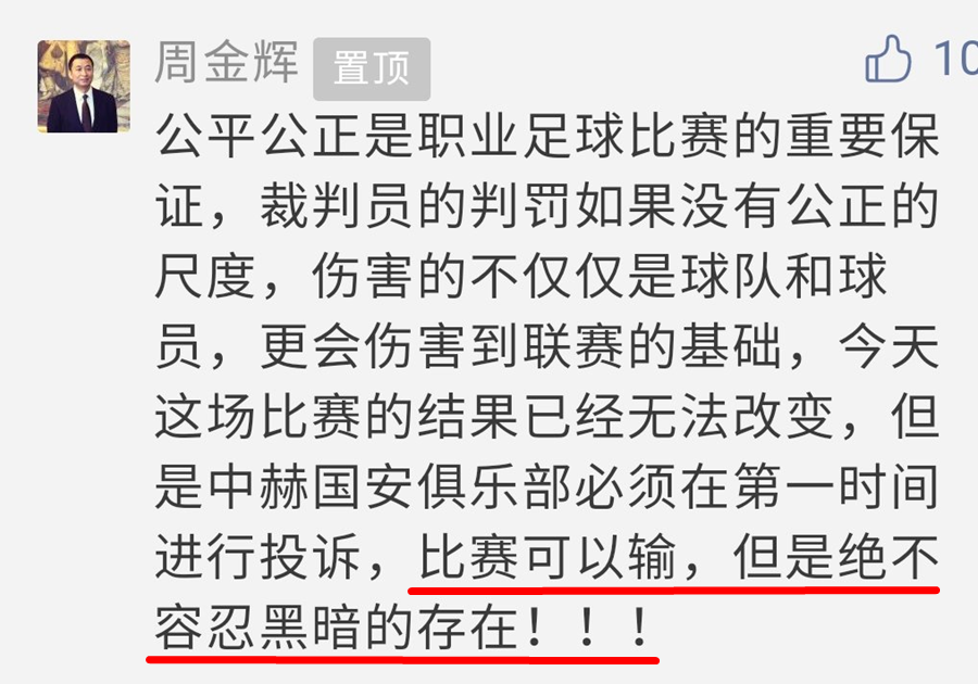 舆情发展如此迅猛,中国足协不能坐视不管,中国足协主席亮相央视《足球之夜》节目,针对裁判问题明确表态:“如果你第一阶段能犯点错误的话,第二阶段就要有要求,因为每场比赛都关系到最后的结果,更加要求中国足协更加高度重视每场比赛的公正、精彩、有序。……某些场次的裁判判罚引发了一些争议,暴露出裁判执法中的一些问题,这个也是要解决的。”