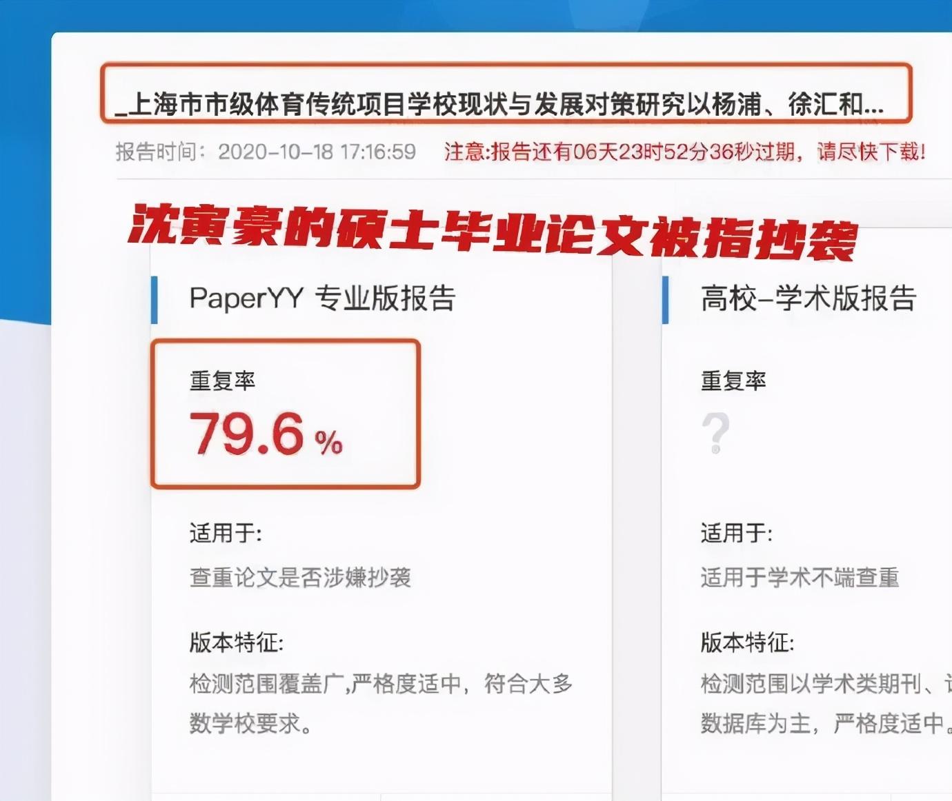 沈寅豪执法尺度不一,引发了鲁能上下以及山东球迷的强烈不满,更有微博网友向沈寅豪供职单位同济大学举报其存在论文抄袭行为,同济大学也向该网友回复了受理告知书。10 月 21 日,有国内媒体曝光,沈寅豪已经离开苏州赛区,返回供职的同济大学,对论文抄袭行为进行解释。