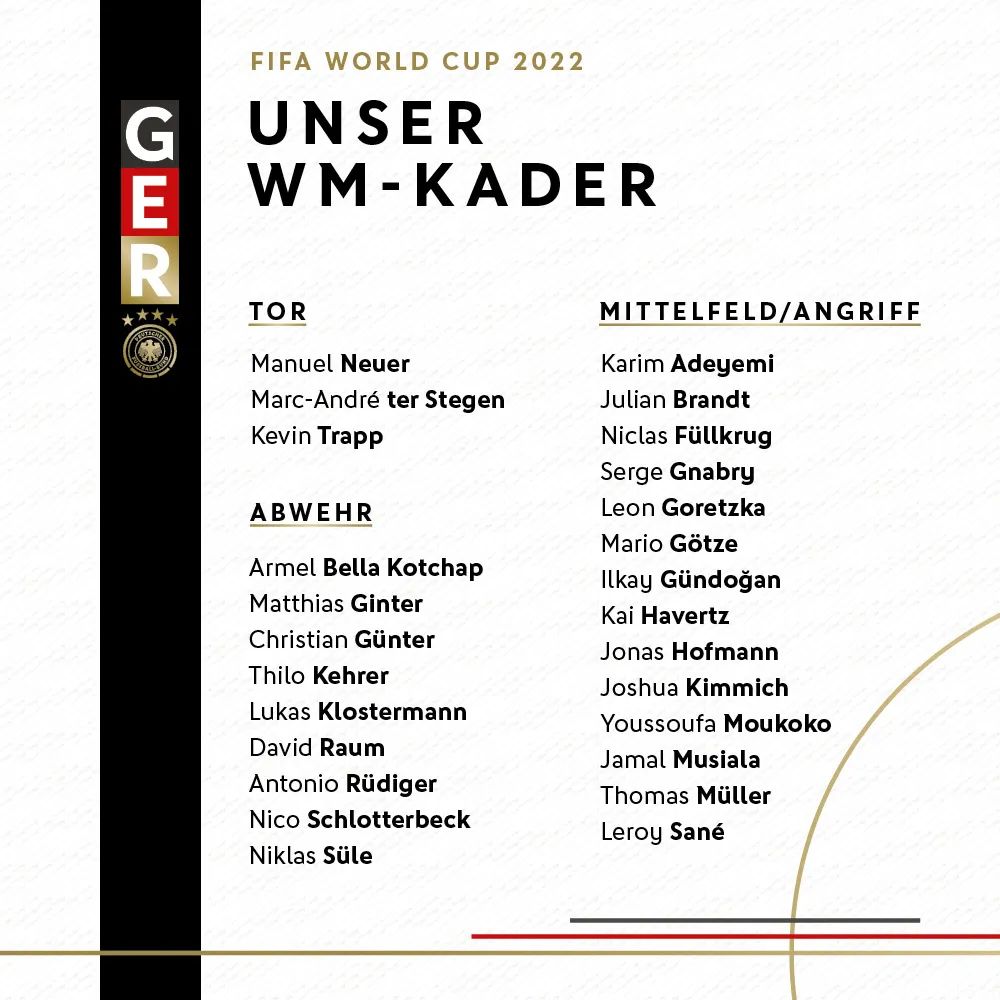 2022卡塔尔世界杯即将拉开大幕,已有不少球队公布出征大名单。11月10日,备受关注的德国队公布了26人世界杯名单: