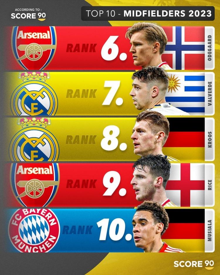 直播吧12月30日讯 《score90》杂志评选出了2023年度十大中场球员,贝林厄姆位居榜首。