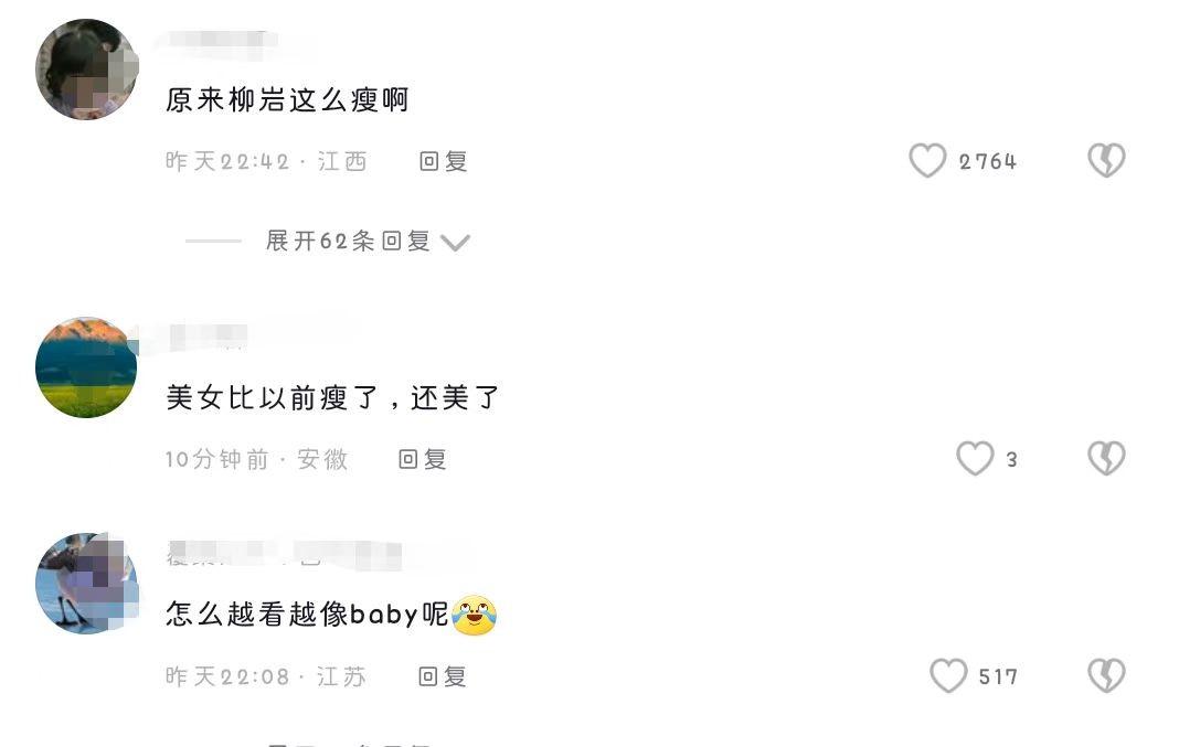 柳岩的跳舞视频一经上传,评论区的网友们都炸翻了天,纷纷感叹“太瘦了”“太美了,真的瘦的好匀称”“腰上没有多余的赘肉是怎么做到的”,还有人评论“怎么越看越像baby”。