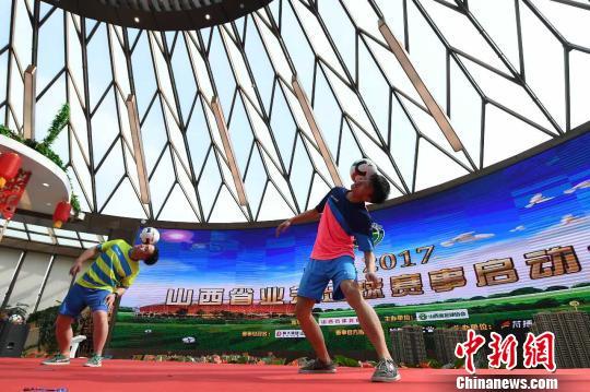 山西省业余足球赛事启动仪式现场的花式足球表演。 武俊杰 摄