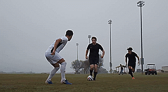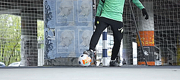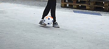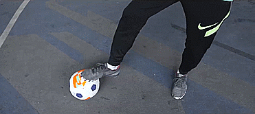 从球放在脚上开始,将球拉向脚的外侧,现在把我们的另一只脚放在我们的支撑腿后面,我们所需要做的就是让球滚到我们的脚上,然后像下图这样用我们的脚趾向上弹球。