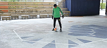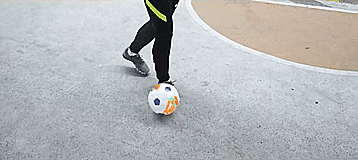 我们将两脚合在一起,确保我们的脚不会离开地面,有点爆发力,用我们的大脚趾击球,将球弹起。