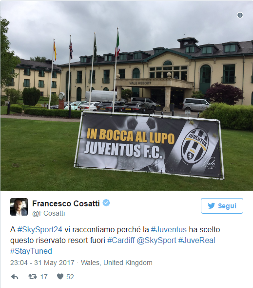 尤文图斯将在周五上午到达加的夫,并从机场直接前往酒店。也许是为了避免受到外界的干扰,这次球队选择的酒店距离球场很远,大约有20公里。与此同时,俱乐部的吉祥物Jay已经提前抵达了加的夫,并发布了自己在街头漫步的视频。
