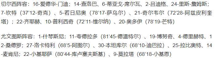 尤文图斯首发: 1-什琴斯尼,6-达尼洛,4-德利赫特,19-博努奇,12-桑德罗,25-拉比奥,30-本坦库尔,27-洛卡特利,20-贝尔纳代斯基,22-小基耶萨,11-夸德拉多