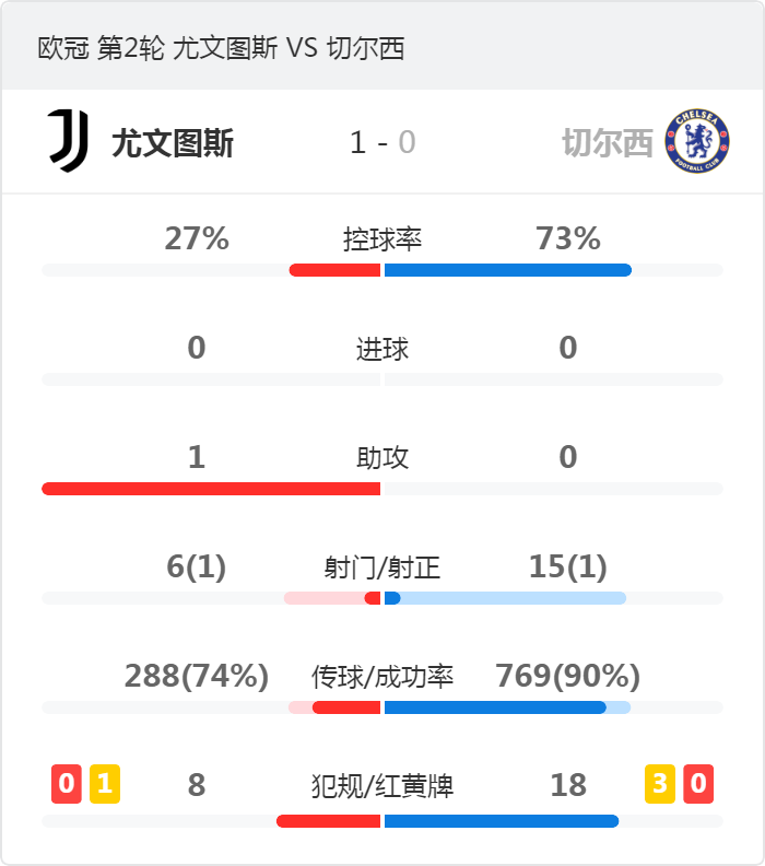 最终,全场比赛结束,切尔西4-0大胜尤文图斯,反超对手升至小组第一,两队同积12分提前出线。