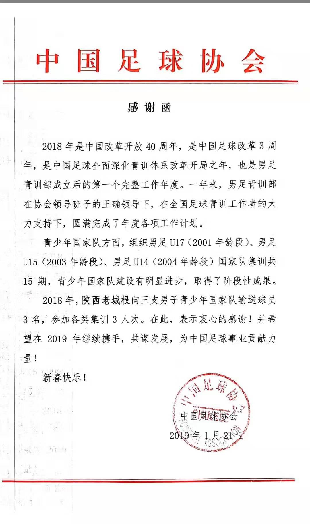 中国足协发来的感谢函