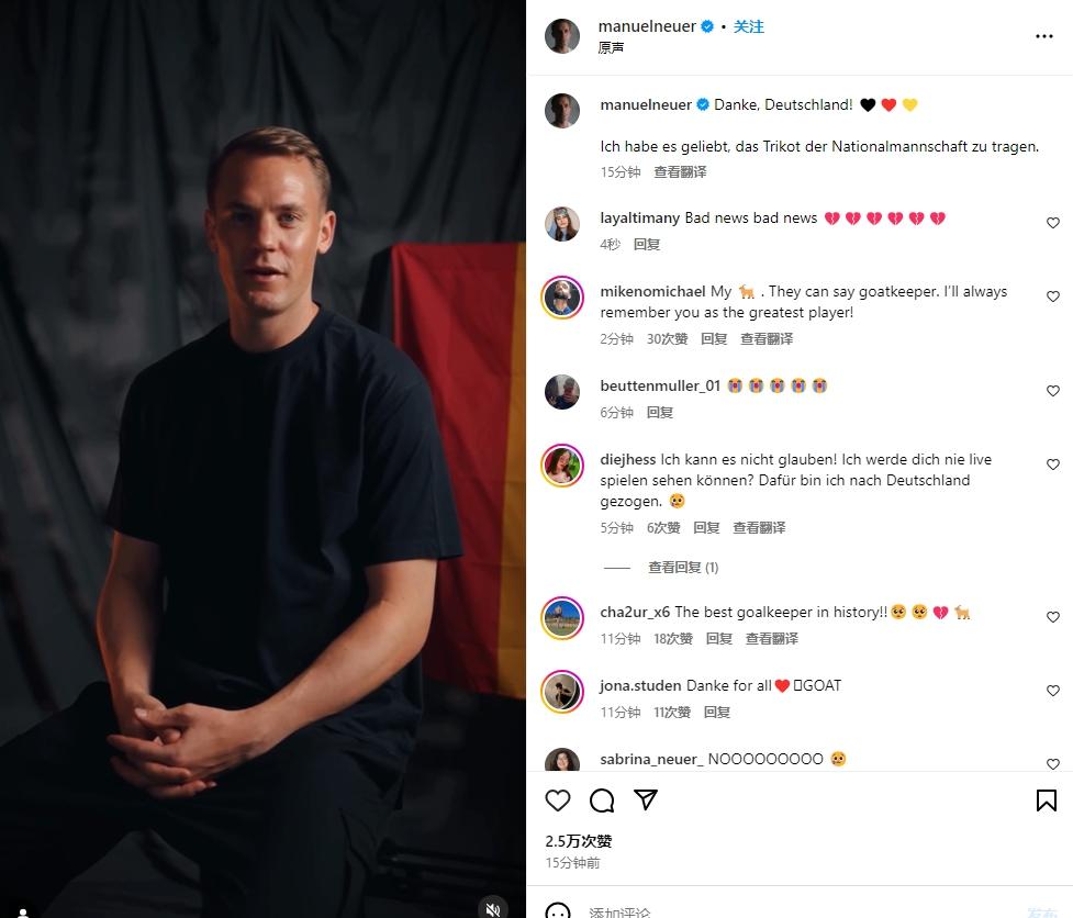 诺伊尔通过一段视频宣布了这则消息,并表示:感谢德国队,我喜欢穿着国家队球衣的感觉。