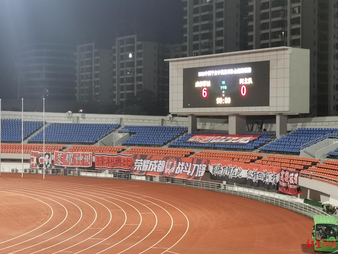 成都蓉城第一个真正意义上的主场,因为各方面的原因,暂时还无法开放看台。不过,成都足协赛前和“红色刀锋”进行了沟通,也得到了双体中心的大力支持。今天上午,“红色刀锋”派出专人赶到双体中心,把过去主场助威时惯用的横幅提前挂到了球场南看台的栏杆上。“成都红色刀锋球迷会”会长陈涛告诉红星新闻记者:“毕竟是成都足球11年来的第一个中超主场,虽然是空场比赛,但作为球迷,我们还是希望能尽可能给球员带去一些激励,传递出‘人不在,旗帜在’ 的想法!”