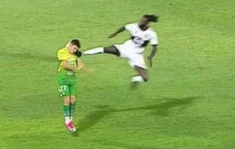 第72分钟时,阿德巴约在中场的位置,争一个高空球,竟然腾空1米6直接亮鞋底爆踹对方前锋的脸部,他还一脸无辜表示并非故意,但随后他被主裁判红牌罚下。