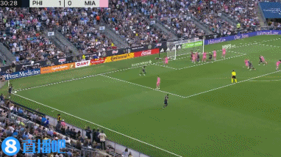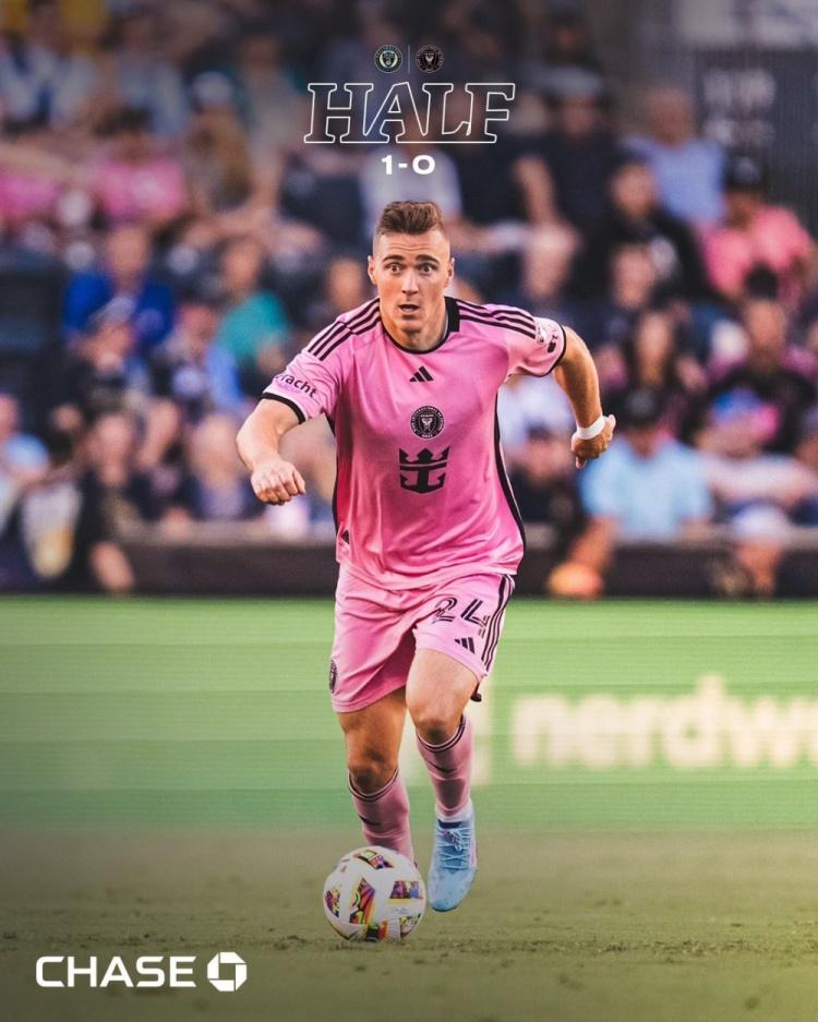 伤停补时1分钟。上半场比赛结束, 费城联合1-0迈阿密国际。