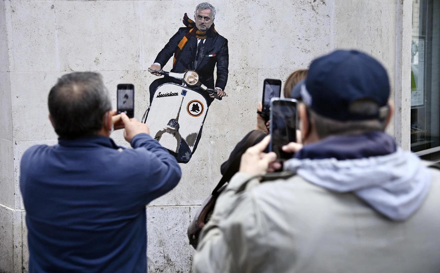 罗马球迷开启盛大欢迎礼,在城市建筑上涂鸦:穆帅骑摩托车抵达城市。路人经过,纷纷止步拍照。冰激凌店适时推出“穆里尼奥款”冰激凌,口味自选,但雪糕上都有穆帅的名字。