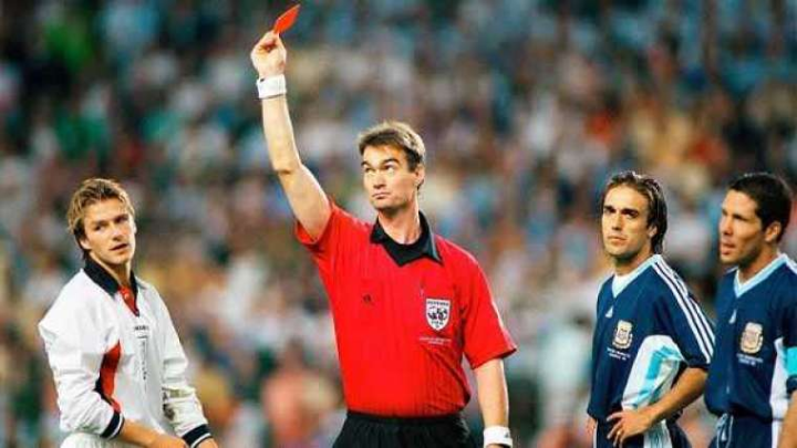 回顾职业生涯,金·米尔顿·尼尔森入行极早,17岁开始就在吹罚比赛,20来岁出头就拥有了吹罚FIFA赛事的资格,三十岁不到就有欧冠赛事吹,各种大赛淘汰赛吹了不少。关于这位仁兄,生涯中最令人印象深刻的一幕嘛,当属他在1998年世界杯英格兰对战阿根廷的淘汰赛中把有蹬腿报复动作的贝克汉姆红牌罚下的决定了。