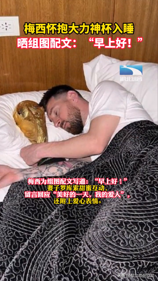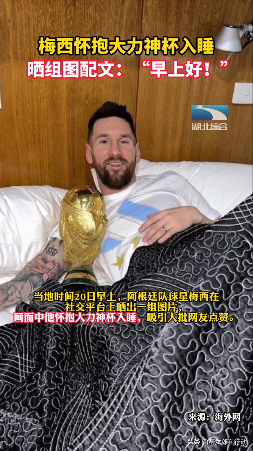 阿根廷当地时间20日早上,阿根廷球星梅西在社交平台上晒出了一组图片,画面中他怀抱大力神杯入睡,吸引大批网友点赞