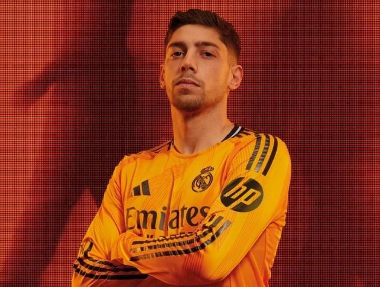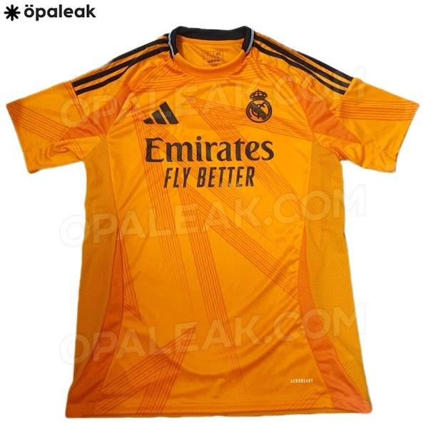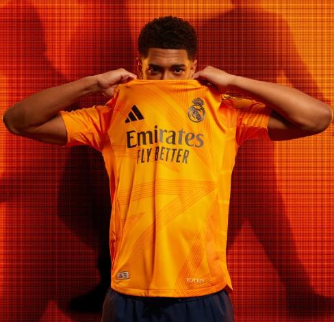 客场球衣则为橙色搭配黑色,领部有白色点缀,球衣同样有纹理设计,这套球衣有点像2013-14赛季的第三球衣,那个赛季皇马赢得了第10座欧冠冠军。