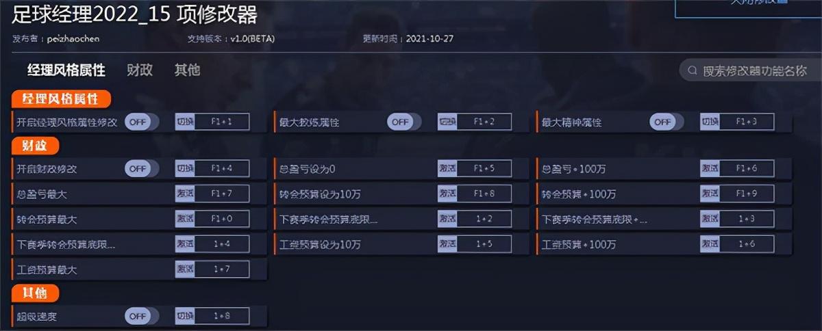 F1+1开启经理风格属性修改F1+2最大教练属性F1+3最大精神属性F1+4开启财政修改F1+5总盈亏设为0F1+6总盈亏+100万F1+7总盈亏最大F1+8转会预算设为10万F1+9转会预算+100万F1+0转会预算最大1+2下赛季转会预算底限设为100万1+3下赛季转会预算底限+100万1+4下赛季转会预算底限最大1+5工资预算设为10万1+6工资预算+100万1+7工资预算最大1+8超级速度
