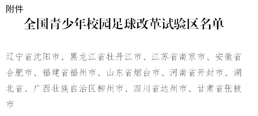 中新网4月26日电 据教育部网站消息,教育部公示11个全国青少年校园足球改革试验区名单,包括辽宁省沈阳市、黑龙江省牡丹江市、江苏省南京市、安徽省合肥市、福建省福州市、山东省烟台市、河南省开封市、湖北省、广西壮族自治区柳州市、四川省达州市、甘肃省张掖市。